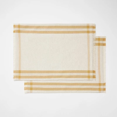 Add a touch of classic elegance to your dining routine with this 2-Pack of Basket Plaid Placemats from Threshold™ designed with Studio McGee. The cloth placemat set includes four rectangular placemats with a tan plaid pattern on a white backdrop and fringed edges for a timeless look that goes well with any table decor. Perfect for everyday use or entertaining, these placemats boast cotton-linen construction and help prevent messes and spills. Simply machine wash for easy care.