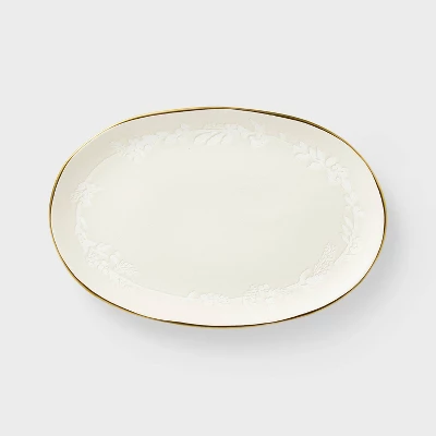 Elevate your festive gatherings with this Stoneware Serving Platter from Threshold™ designed with Studio McGee. This serving platter features a pristine white surface adorned with an etched floral pattern and a golden rim for a visually appealing presentation. Made from stoneware, this oval dish is the ideal choice for serving snacks, starters, bread or other delectable appetizers. Plus, it’s dishwasher and microwave safe for easy cleaning and reheating.