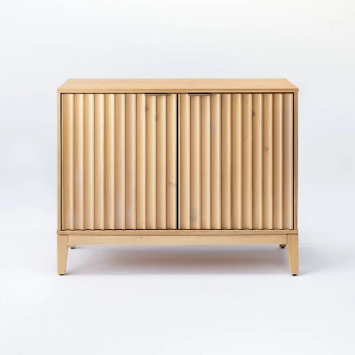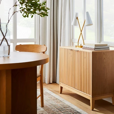 Add elegance and style to your home decor with the Thousand Oaks Wood Scalloped 2-Door Cabinet from Threshold™ designed with Studio McGee. This mid-century modern-inspired cabinet comes with two doors featuring an appealing scalloped design. This functional yet fashionable cabinet can be placed in the living room, entryway or any other space to help keep your items organized, while the tabletop offers ample space to display books, vases and more.