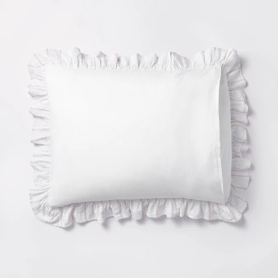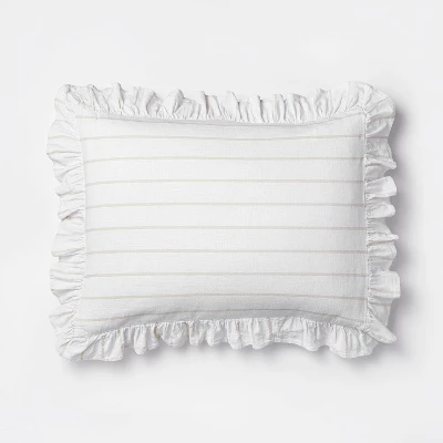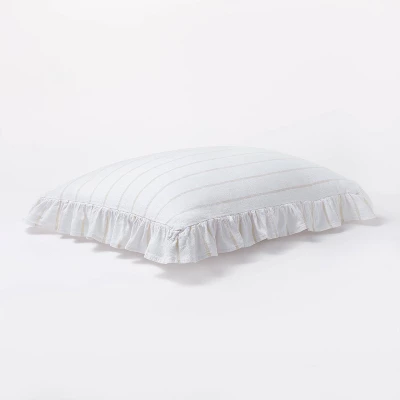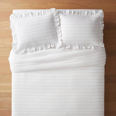 Dress up your bedscape with this Yarn Dye Stripe with Ruffle Duvet Cover & Sham Set from Threshold™ with Studio McGee. This striped bedding set includes two standard shams and a matching duvet cover that’s detailed with ruffle accents on the hem for coordinated style. Made from cotton material, this duvet cover bedding set brings you year-round comfort. Plus, it comes with a end closure on the pillowcase and buttons on duvet cover that allow you to keep the inserts easily and neatly tucked in.